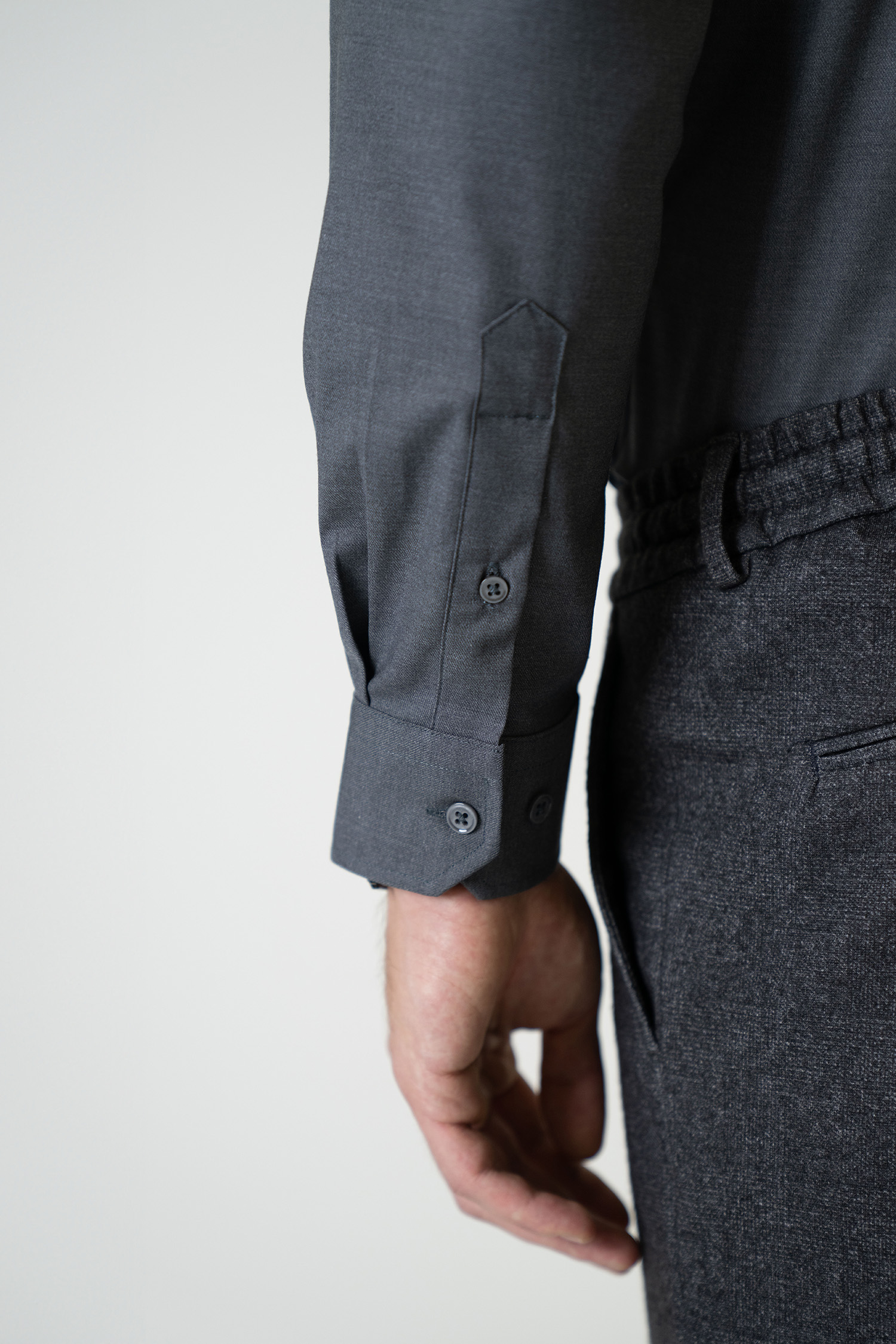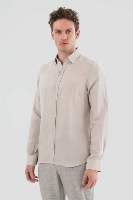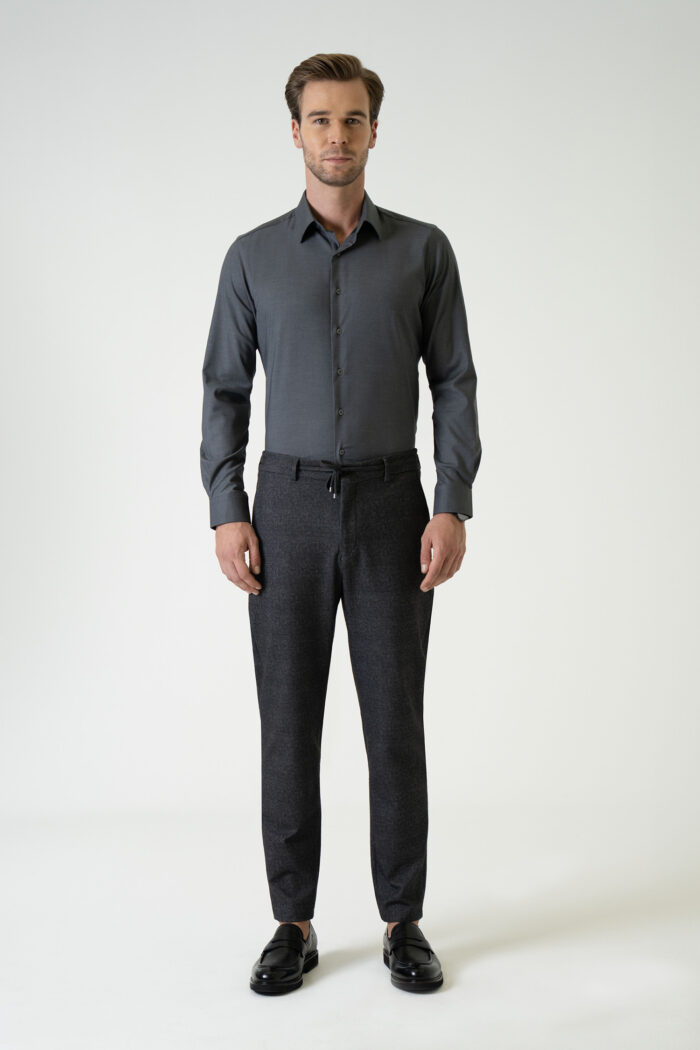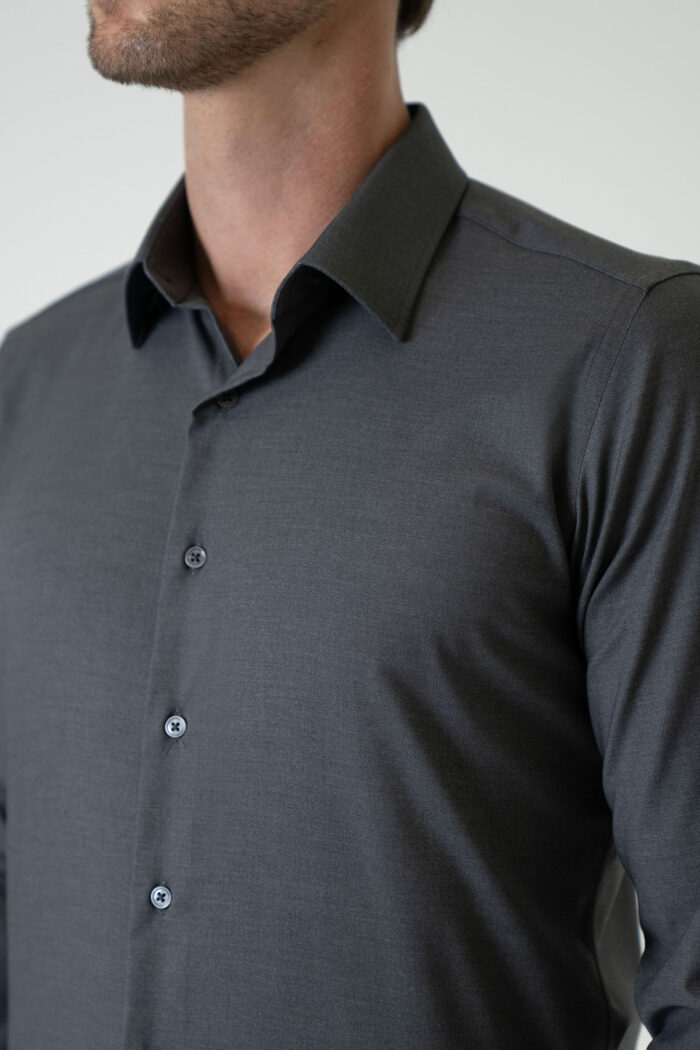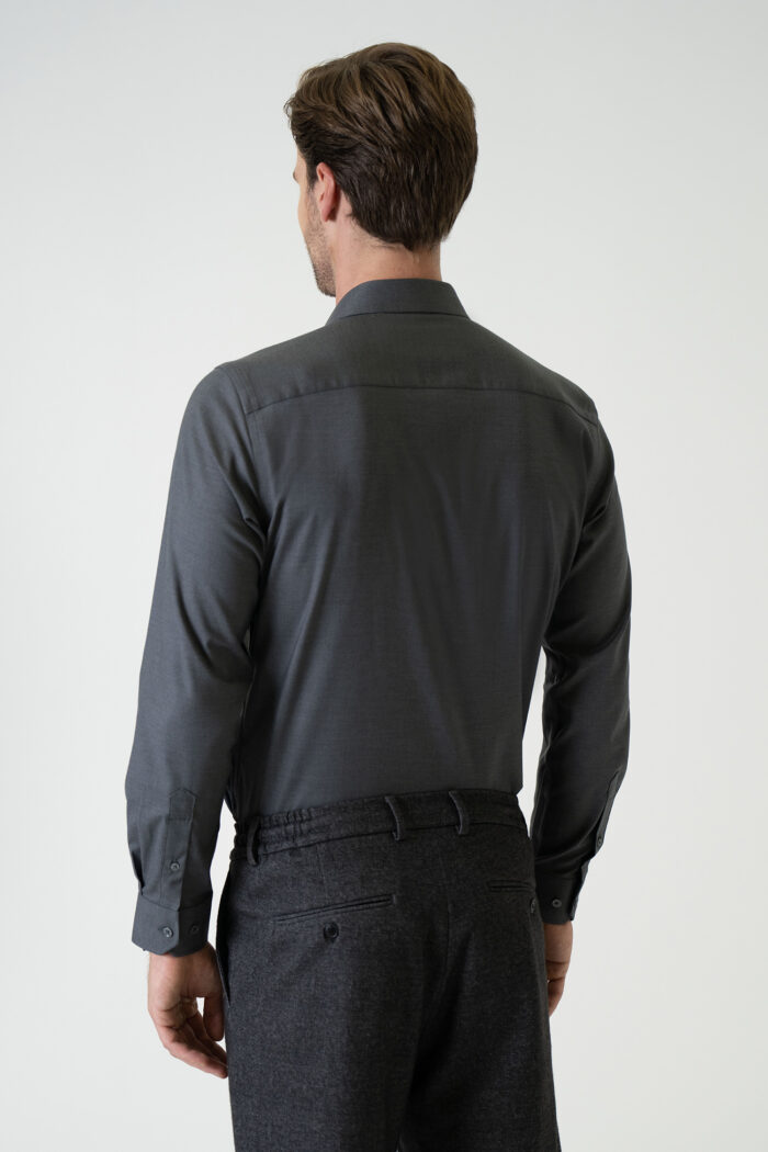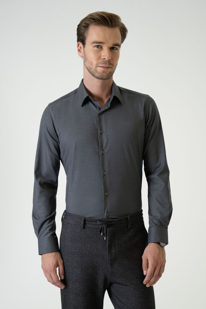 Standing out with its elegant and modern design, this dark grey shirt combines style and comfort. Its finely textured fabric ensures breathability throughout the day, while the tailored fit provides a contemporary look. Featuring a classic collar, tone-on-tone button details, and cuffed sleeves, it offers a timeless style suitable for both office wear and everyday use.
