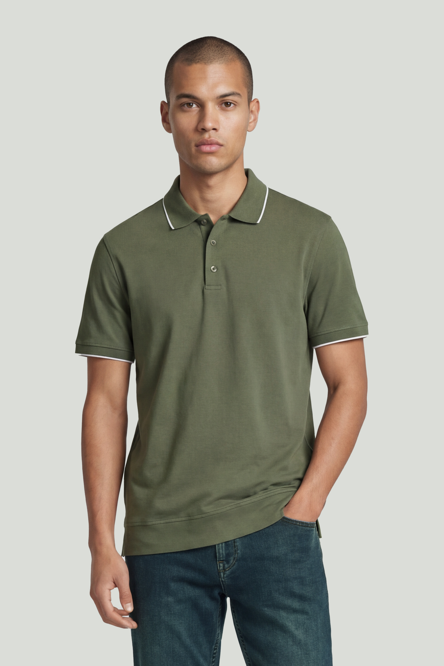 Standing out with its khaki tone—a modern take on natural colors—and the smooth, subtly lustrous surface of mercerized cotton, this polo T-shirt completes its minimal design with fine contrast details. It offers a perfect balance of everyday elegance and comfort.