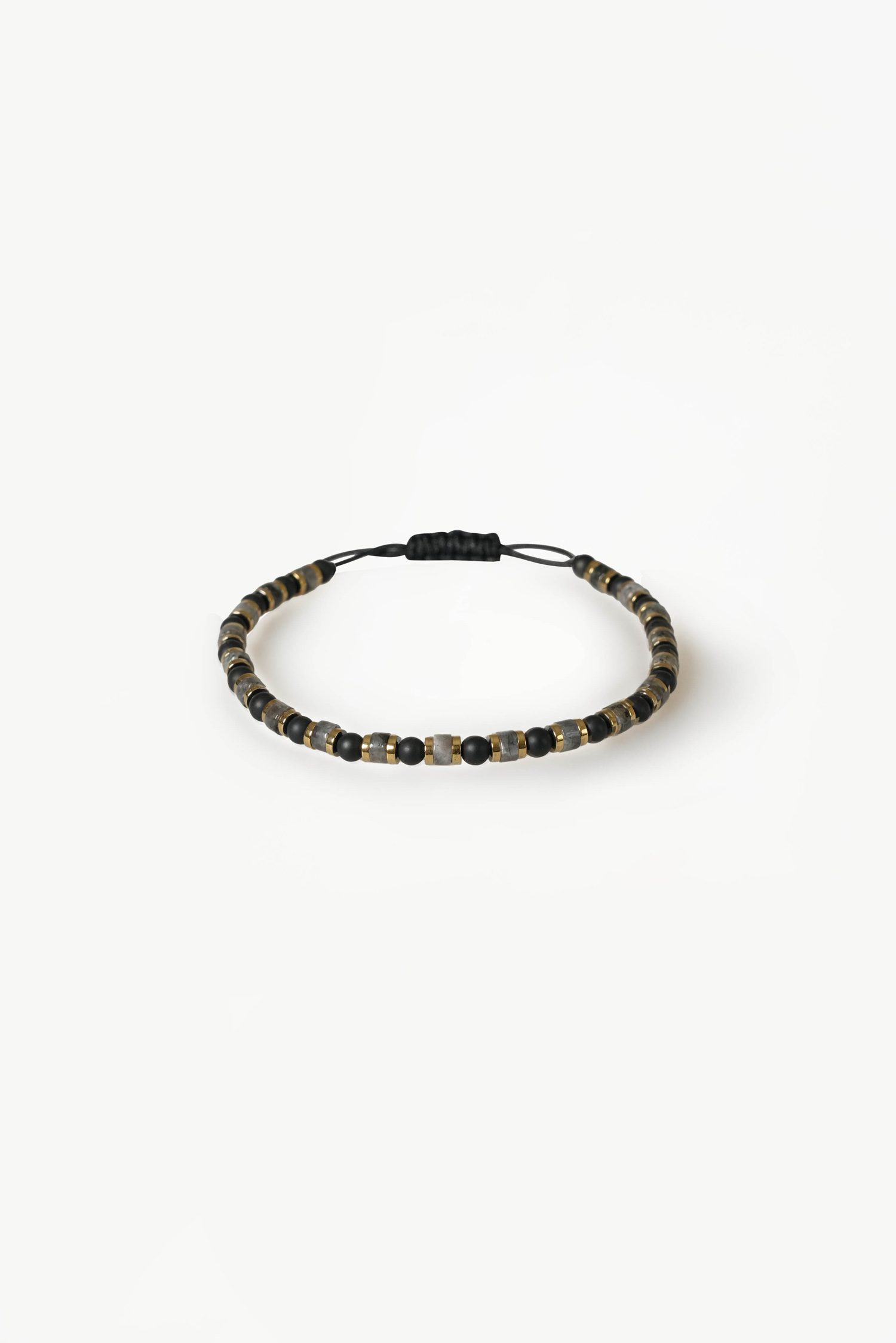 Enriched with modern touches, this bracelet features a sophisticated design where natural stones meet bronze-toned metal details. Each bead is carefully strung to create a simple yet striking look. The adjustable cord mechanism allows it to fit comfortably on different wrist sizes.