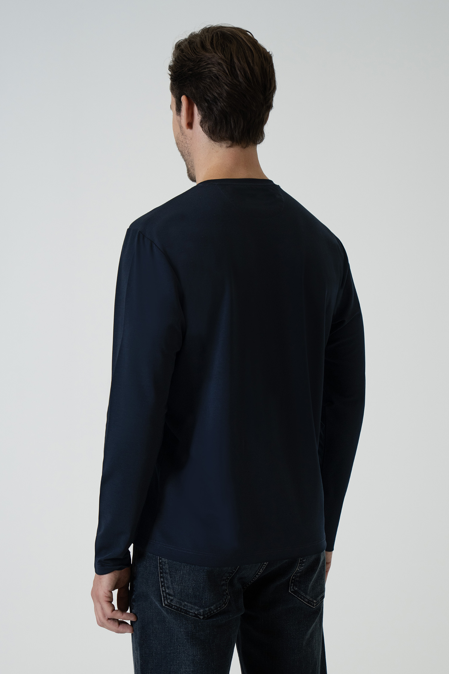 With its simple and modern look, this navy blue long-sleeve t-shirt will become a wardrobe essential. Its relaxed fit and minimalist design provide effortless elegance for daily outfits, while the soft texture ensures all-day comfort.