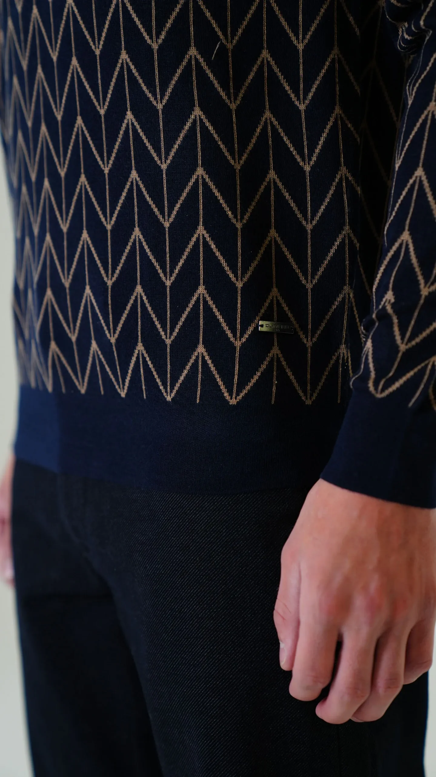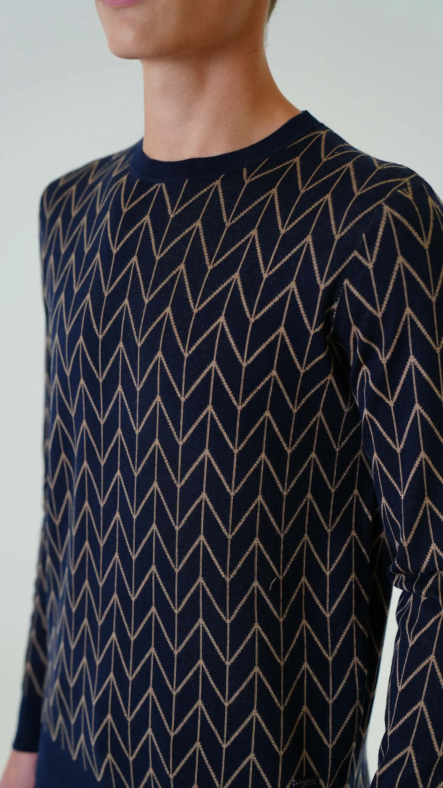 Beige geometric patterns on a navy base give this fine knit sweater a modern and eye-catching character. Its lightweight texture and fluid structure add a refined dynamism to both daily outfits and smart-casual looks.