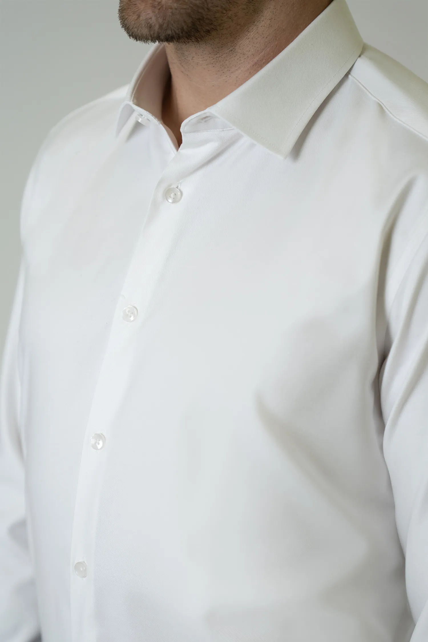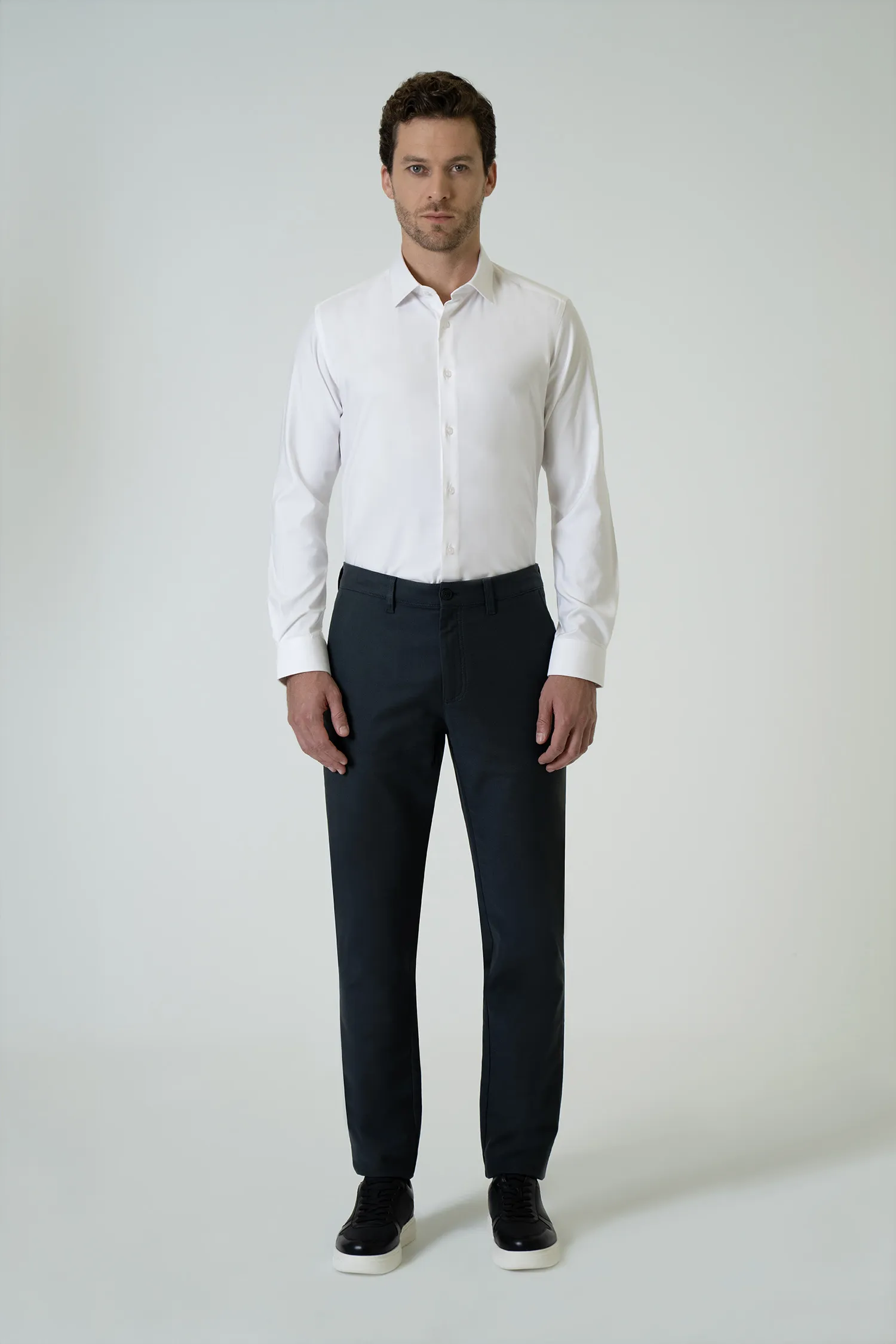 Благодаря своему классическому белому оттенку и современному приталенному крою, эта рубашка по-новому интерпретирует классическую элегантность, подходящую как для офисного стиля, так и для нарядов на особые случаи. Гладкая поверхность и струящаяся ткань обеспечивают комфорт в течение всего дня, придавая при этом изысканный и утонченный вид.
